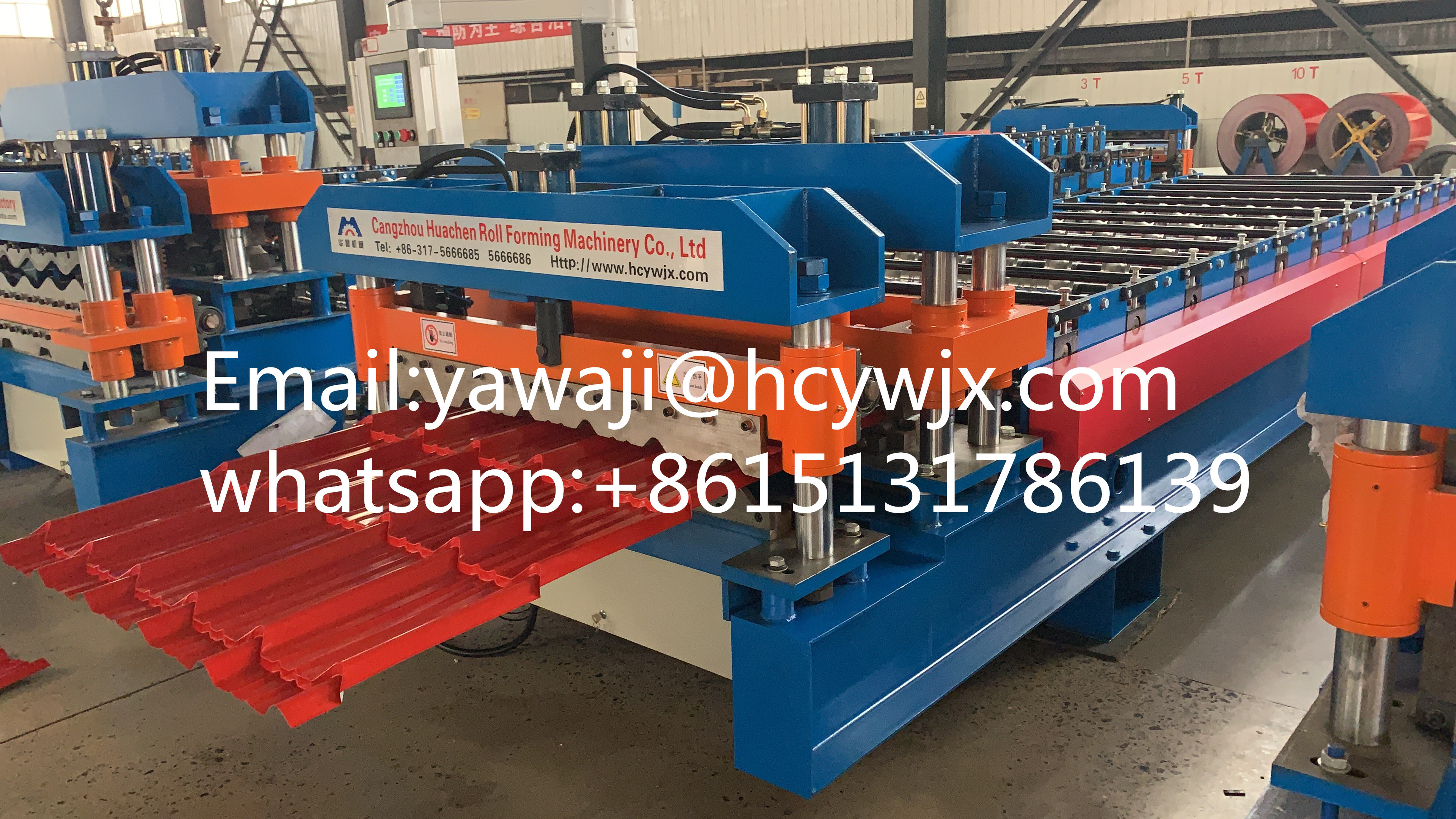 A máquina de moldagem de telhas vidradas inclui: máquina de moldagem, estação hidráulica, estante de descarregamento, corte de moldagem, caixa de controlo e estante de descarregamento.